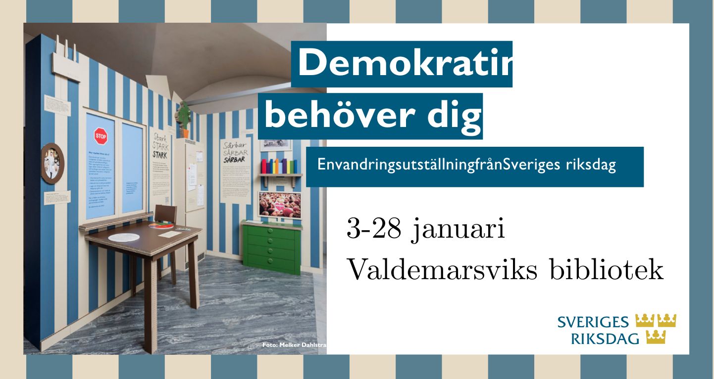 Varför är demokrati viktigt? Kan vi ta den för givet? Hur engagerar man sig i vardagen? Svaren på frågorna finns i Sveriges riksdags vandringsutställning ”Demokratin behöver dig!” som nu kommer till Valdemarsviks bibliotek.